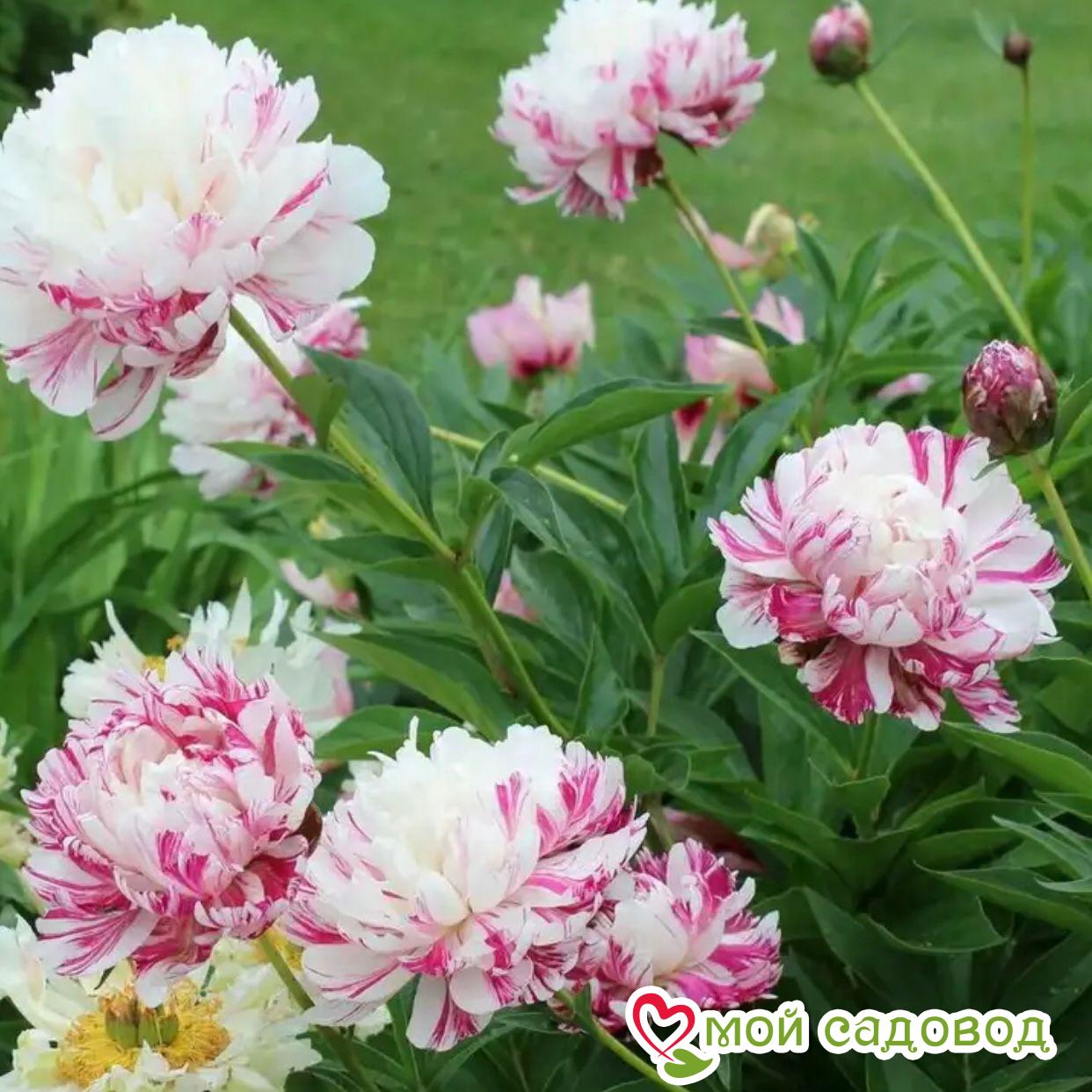 Махровый шаровидный. Цветок эффектный, белый с малиново-красными полосками. Листья глянцевые, тёмно-зелёные. Высота 60-80 см. Срок цветения средне-поздний. Место посадки Для посадки пионов понадобится защищенное от ветров место с хорошей освещенностью. Сорта светлой окраски, а также пионы с простыми и полумахровыми цветками можно посадить на частично затеняемом участке, это продлит цветение и защитит цветы от выгорания. Почва для посадки Залог успешного цветения пиона в будущем — это подготовка почвы! 1. Подготовка ямы — 70*70 см на скудных песчанистых и торфянистых почвах — 50*50 см на плодородных, окультуренных почвах. ХРАНЕНИЕ ДО ПОСАДКИ: После получения посылки, рекомендуем вскрыть пакет и осмотреть корневище. Почки должны быть плотные и розового цвета. Так же уделите внимание самому корневищу, все сомнительные, потемневшие, сморщенные части удалите, а места среза обработайте зеленкой или залой. Если почки еще не тронулись в рост, а высаживать в открытый почву рано, советуем Вам хранить корневище в холодильнике, обязательно оставляя его в пакете с торфяной смесью или в коробке под снегом. Если почки успели раскрыться это не критично, сохранить до посадки их так же возможно, высадите корень пиона в большой просторный горшок или в любую другую ёмкость.
